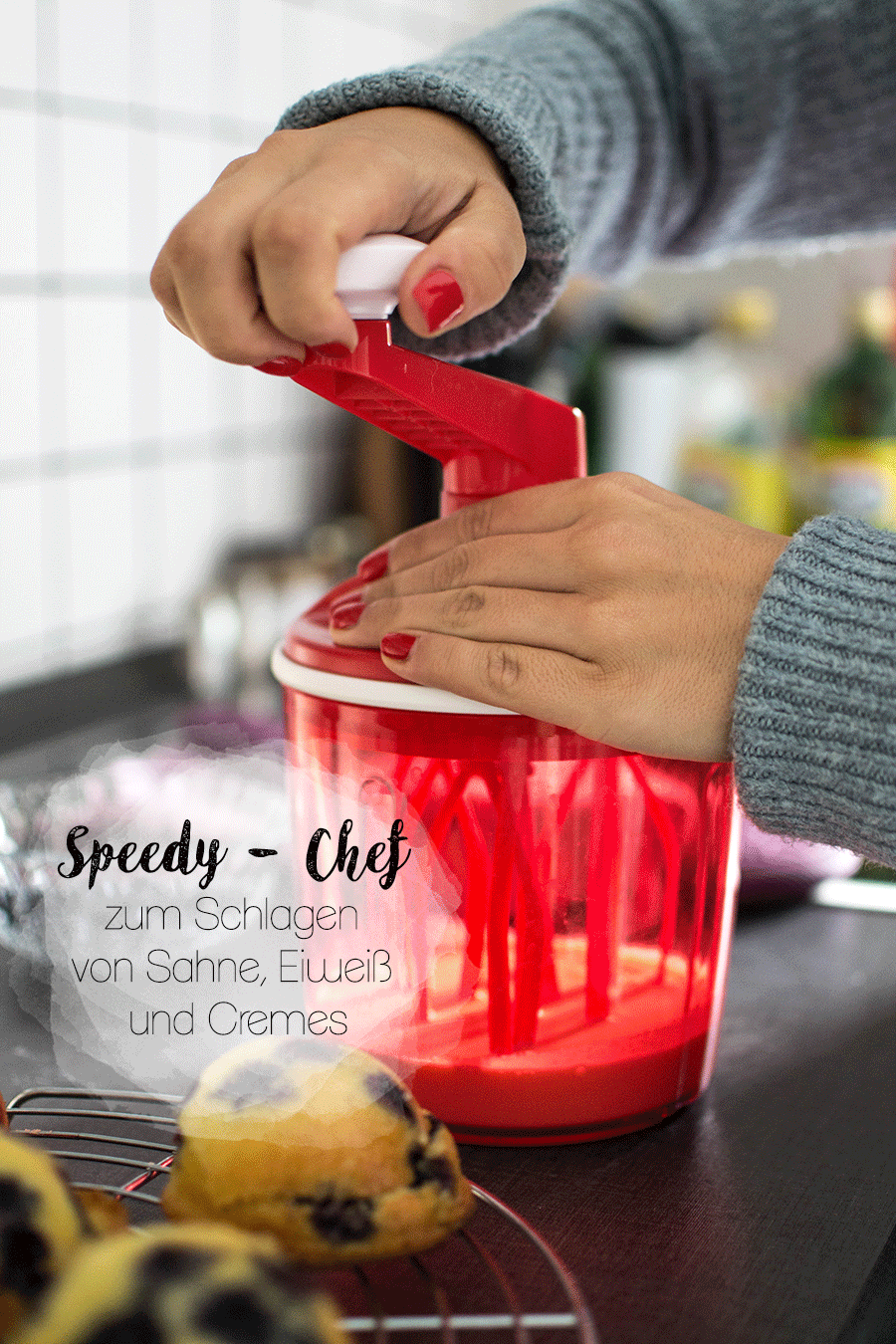Ihr kennt es; ihr schlagt Sahne in einer Rührschüssel und die gesamte Küche ist weiß gesprenkelt. Zumindest war das bis lang bei mir der Fall. Mit dem Speedy – Chef ist das nun Geschichte; der geschlossene Behälter sorgt für Spritzschutz. Außerdem geht’s manuell genau so gut wie mit dem Mixer. Einfach den Hebel einige Minuten schnell drehen und ihr habt ein perfektes Ergebnis.